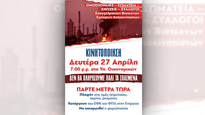 «Με τον ιμπεριαλιστικό πόλεμο να κλιμακώνεται, ήδη φαίνονται οι πρώτες επιπτώσεις στις μικρές επιχειρήσεις, αφού οι αυξήσεις σε καύσιμα, ενέργεια, πρώτες ύλες χτυπάνε “κόκκινο”, συμπαρασύροντας συνολικά το κόστος ζωής και λειτουργίας. Το πετρέλαιο κίνησης έχει ήδη αυξηθεί κατά 41%, το υγραέριο και φυσικό αέριο 25%, ενώ το ηλεκτρικό ρεύμα έχει ήδη ξεπεράσει το 16%.