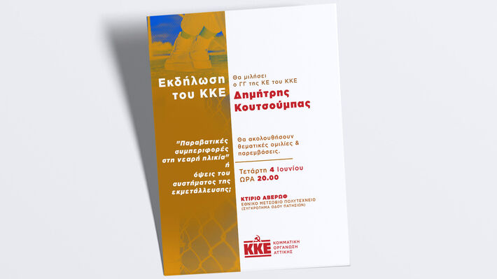 Ο ΓΓ της ΚΕ του ΚΚΕ Δημήτρης Κουτσούμπας θα μιλήσει την Τετάρτη 4 Ιουνίου στις 20.00, σε εκδήλωση που πραγματοποιεί η Κομματική Οργάνωση Αττικής με θέμα: «Παραβατικές συμπεριφορές στη νεαρή ηλικία ή όψεις του εκμεταλλευτικού συστήματος;», στο Εθνικό Μετσόβιο Πολυτεχνείο (κτίριο Αβέρωφ, συγκρότημα Πατησίων).