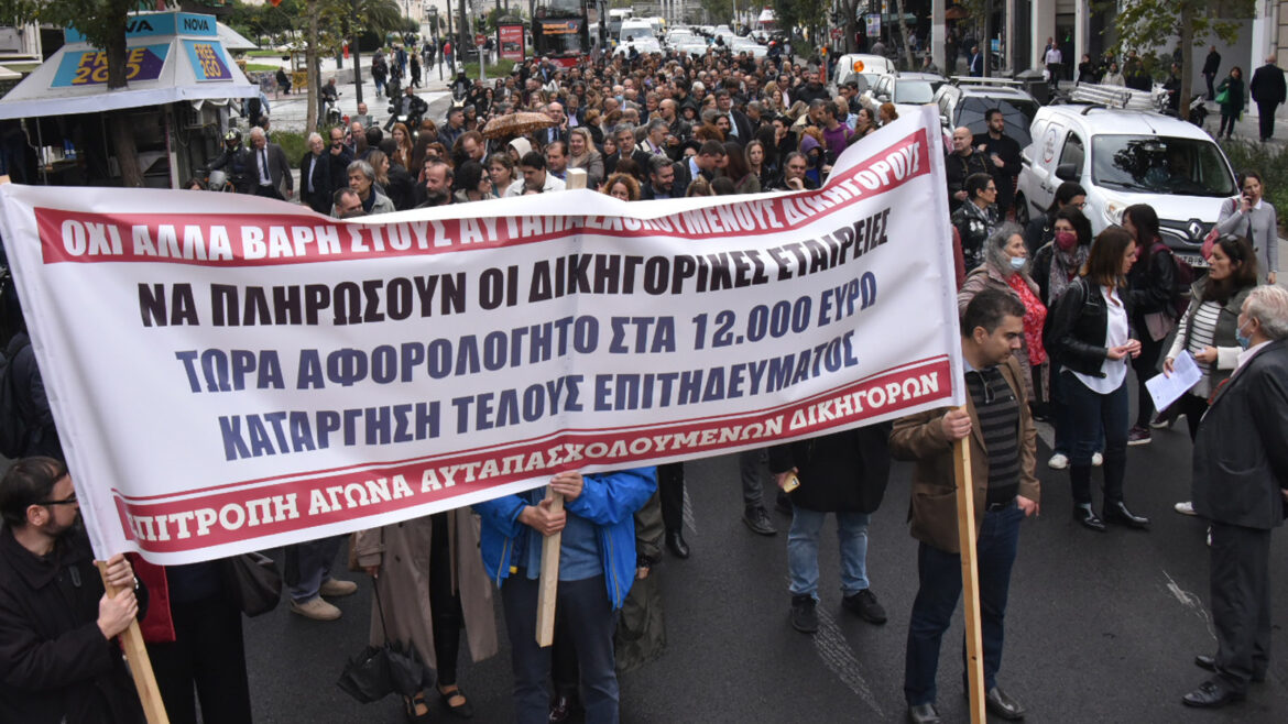 Να πληρώσουν οι δικηγορικές εταιρείες και όχι οι μικροί επαγγελματίες απαιτεί η Επιτροπή Αγώνα Αυτοαπασχολούμενων Δικηγόρων. Η θεσμοθέτηση αφορολόγητου στα 12.000 ευρώ και η κατάργηση του τέλους επιτηδεύματος είναι οι διεκδικήσεις που προέτασε στο πανό της.