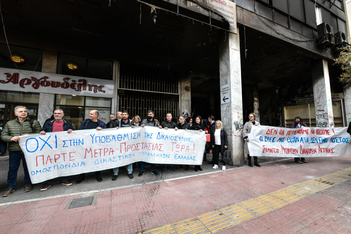 «Οσα συνέβησαν εδώ είναι αποτέλεσμα μιάς πολιτικής που δεν λογαριάζει τίποτα μπροστά στο κέρδος, που θεωρεί τη ζωή μας κόστος. Συμπαραστεκόμαστε στους συναδέλφους μας, απαιτούμε να εργαζόμαστε σε σύγχρονα και ασφαλή κτίρια, διεκδικούμε τα δικαιώματά μας, τα δίκαια αιτήματά μας και θα είμαστε εδώ για να συνεχίσουμε τον αγώνα», τόνισε ο Στρατής Δουνιάς από τον Σύλλογο Δικαστικών Υπαλλήλων Αθήνας.