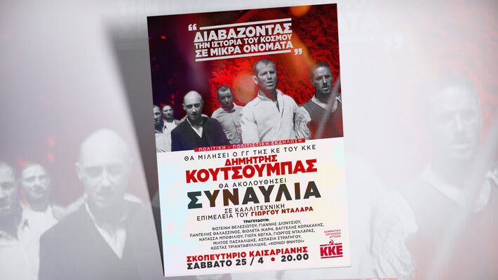 Με τίτλο παρμένο από στίχο από το «Καπνισμένο Τσουκάλι», που έγραψε ο Γιάννης Ρίτσος εξόριστος στο στρατόπεδο συγκέντρωσης πολιτικών κρατουμένων στο Κοντοπούλι της Λήμνου, «Διαβάζοντας την Ιστορία του κόσμου σε μικρά ονόματα», η Κομματική Οργάνωση Αττικής του ΚΚΕ απευθύνει πλατύ κάλεσμα συμμετοχής στη μεγάλη εκδήλωση.